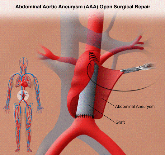 This stent graft is opened inside the aorta and fastened in place. The stent graft stays in place, and blood flows through it. It protects that part of the aorta, and prevents the aneurysm from bursting.